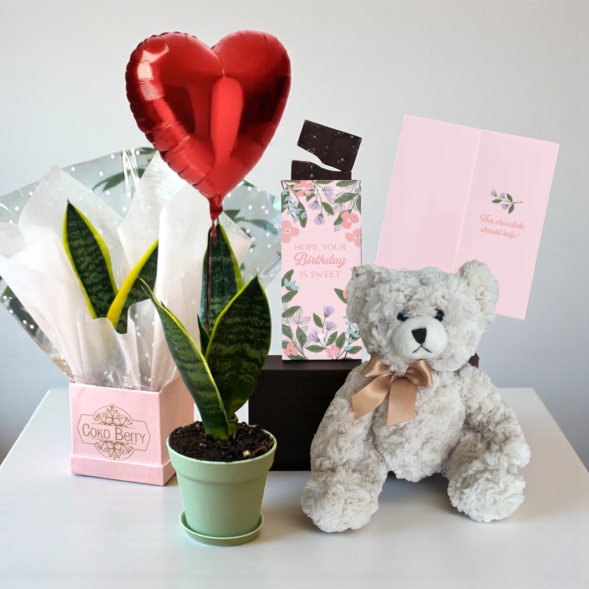 Please note: plant type, color balloon, gretting card desing and teddy bear style may vary depending on availability.