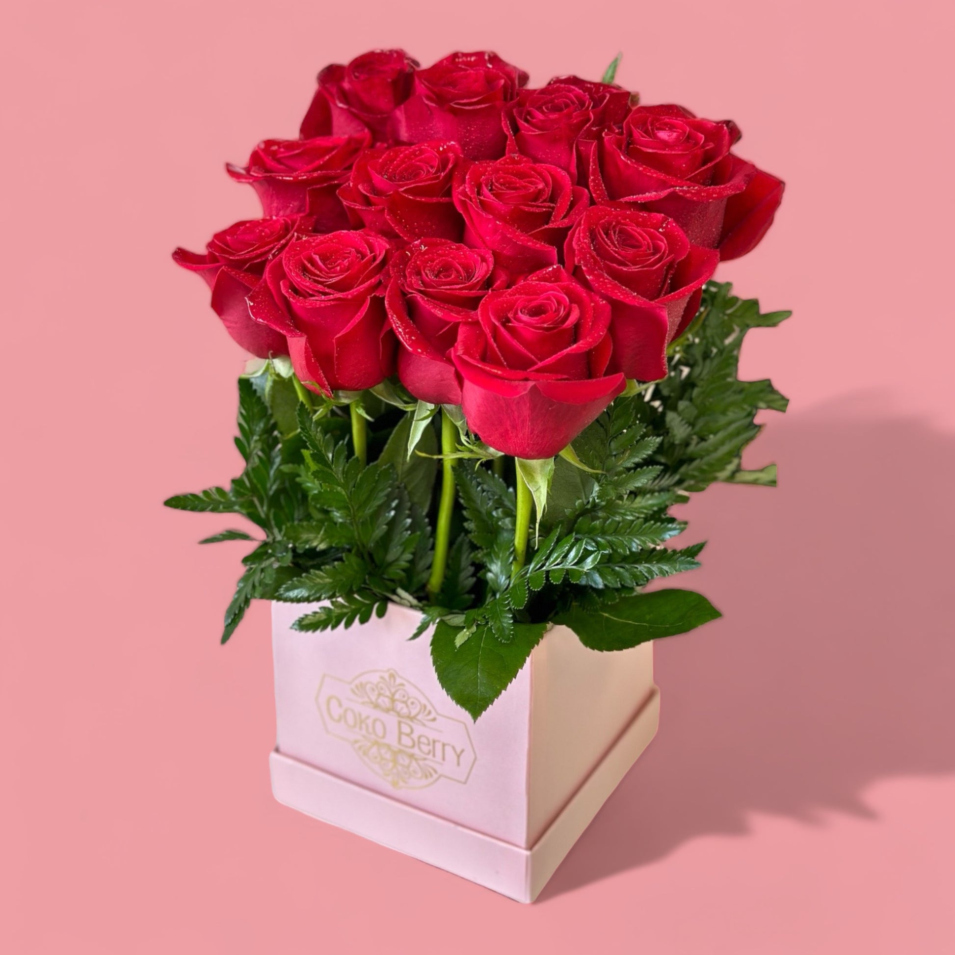 The beautiful box is made of rigid cardboard and have natural roses. It is accompanied by a beautiful bow.