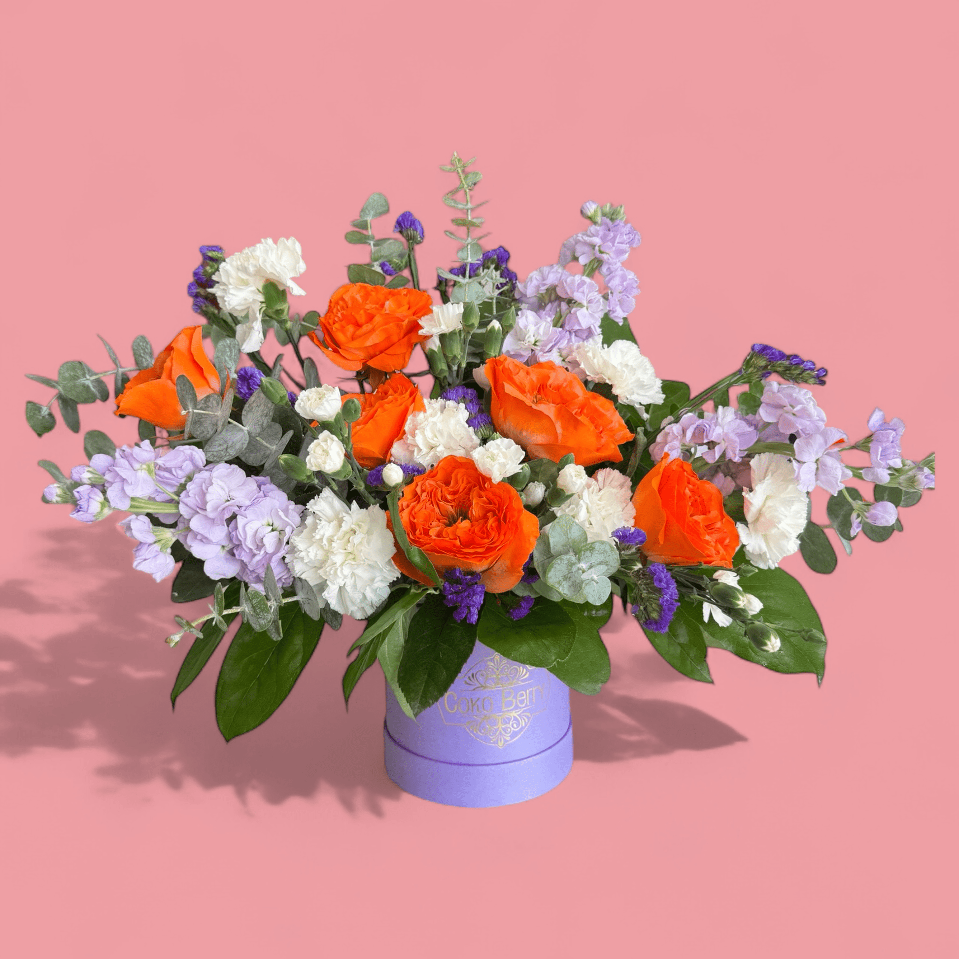 Celebrate Halloween with elegance and color. The Halloween Glow Flower Box features a stunning blend of bright orange roses, lilac stock, and creamy white carnations — a modern, joyful twist on classic fall tones. Designed to light up any space with warmth and charm.