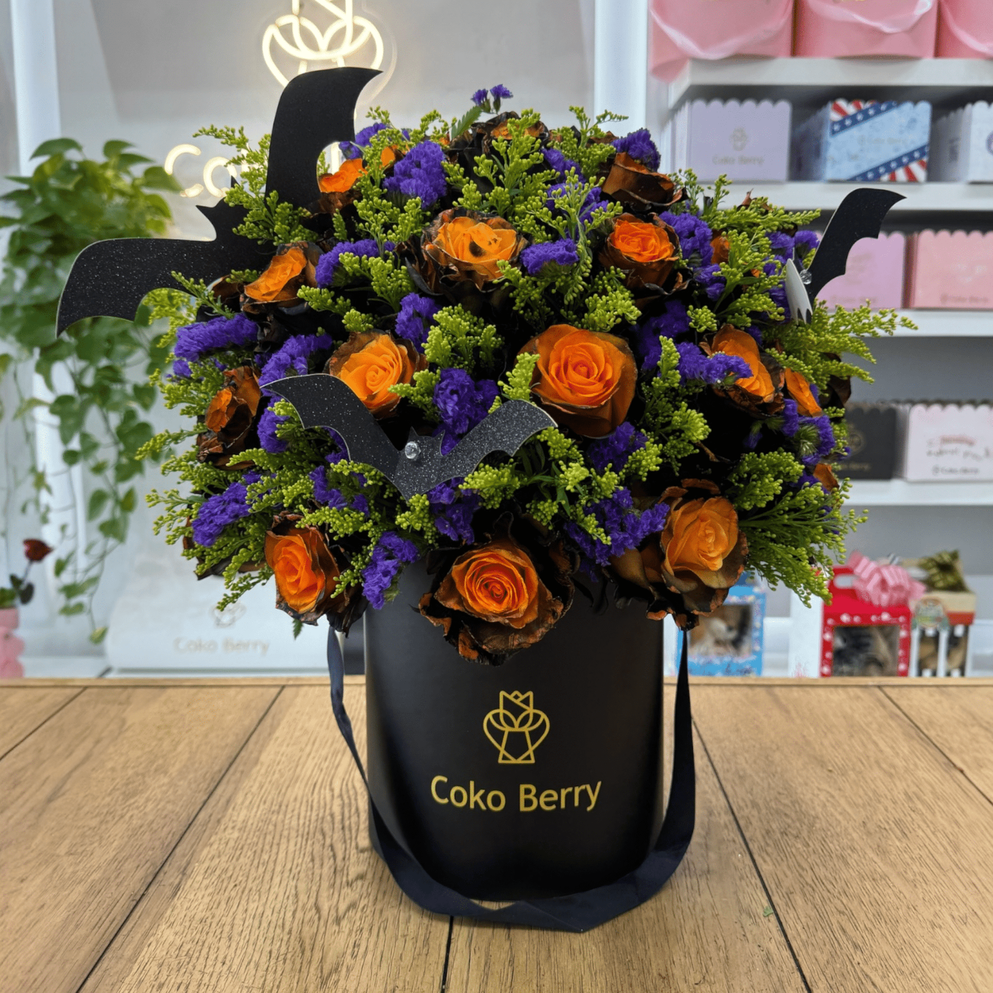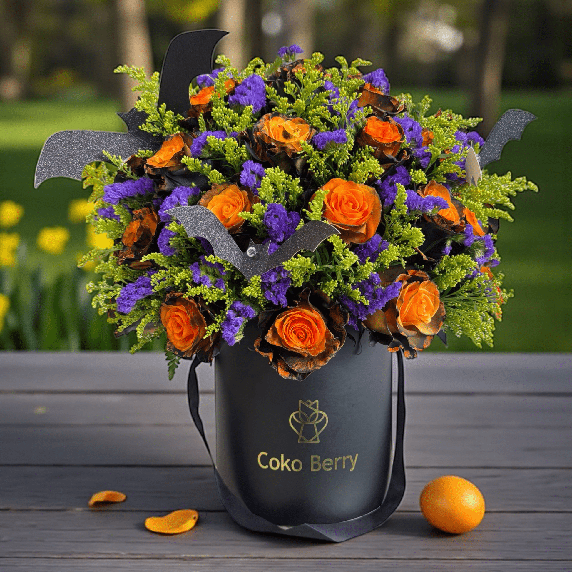 Celebrate the Spooky Season with this stunning floral box featuring vibrant orange roses, purple statice, and lush greenery, accented with playful black bats.