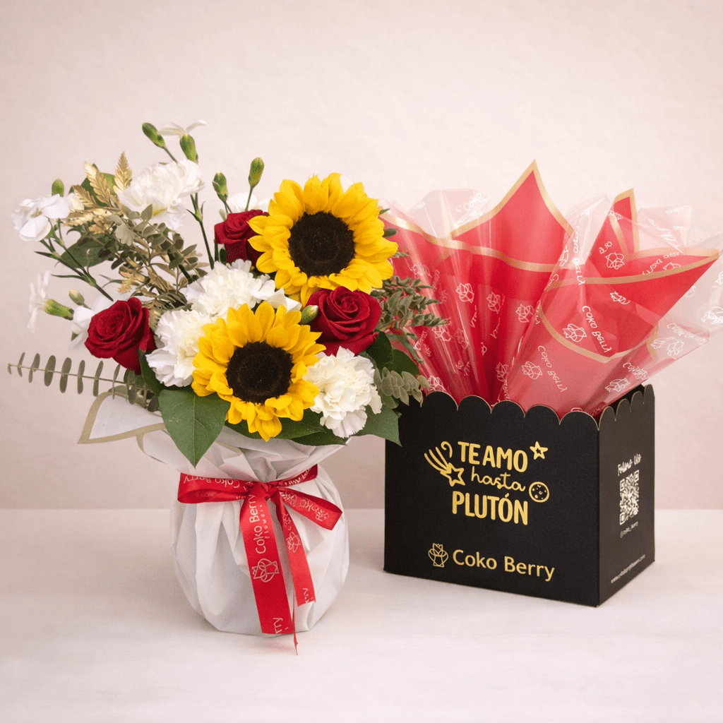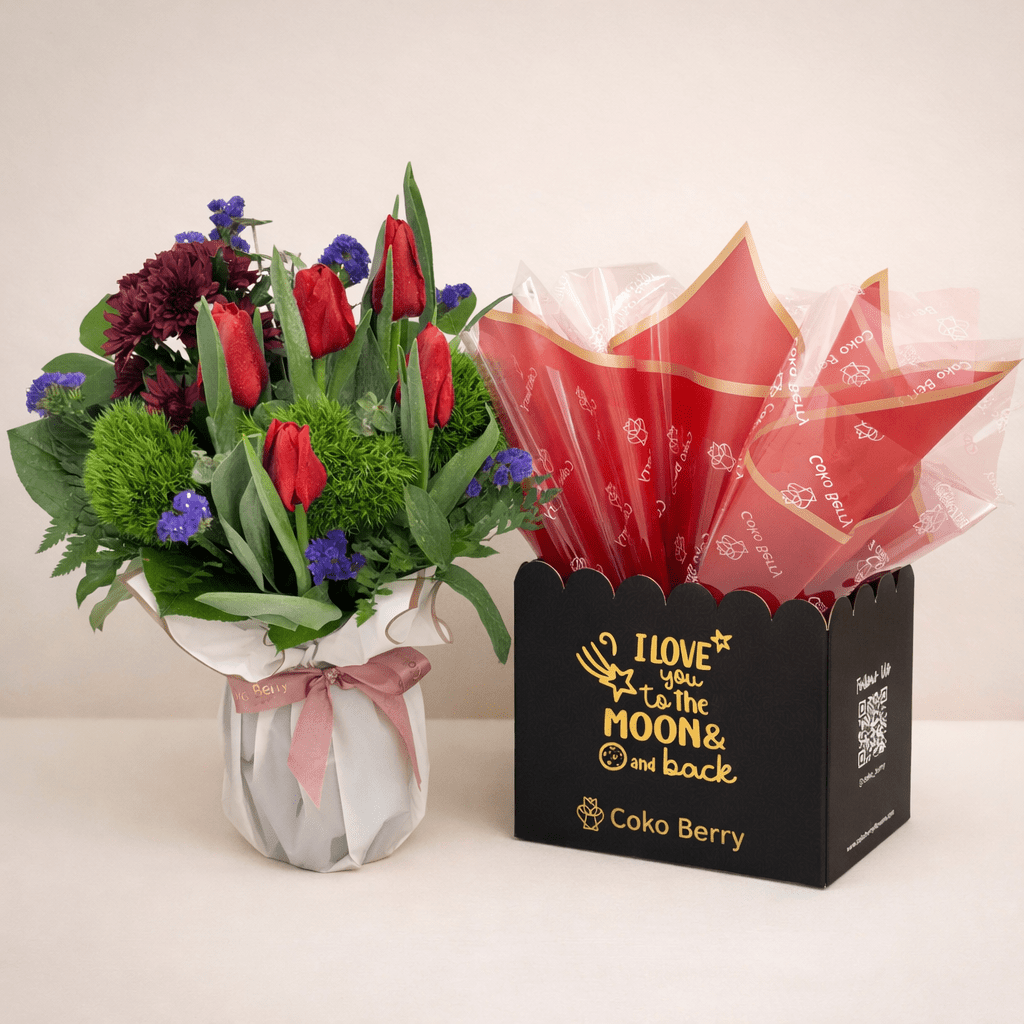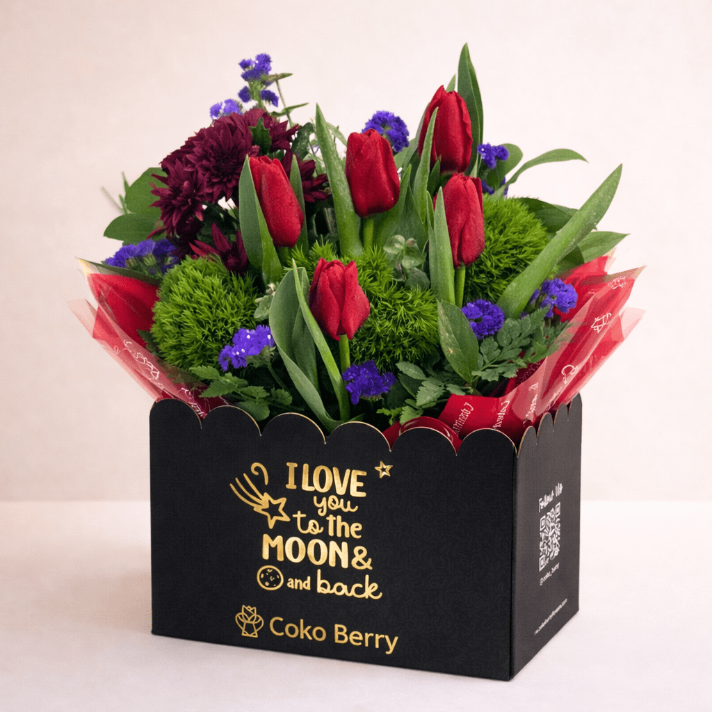 Our flower box are made with our waterproof paper, flowers in a glass vase and it in a box with the message: I love you to the moon and back.