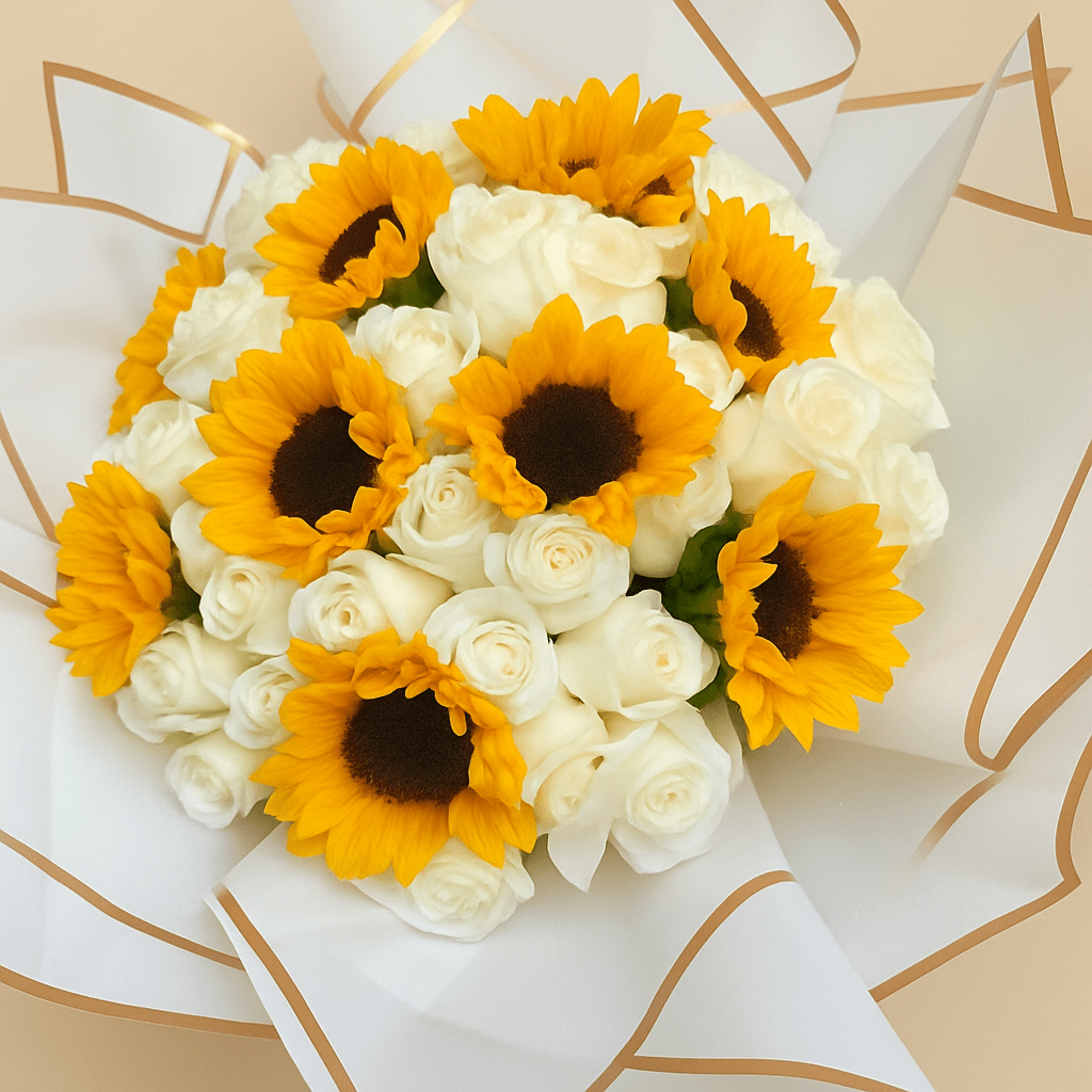 Make a bold statement with this stunning bouquet of fresh sunflowers and mix roses, wrapped in premium black and gold paper for an elegant finish.
