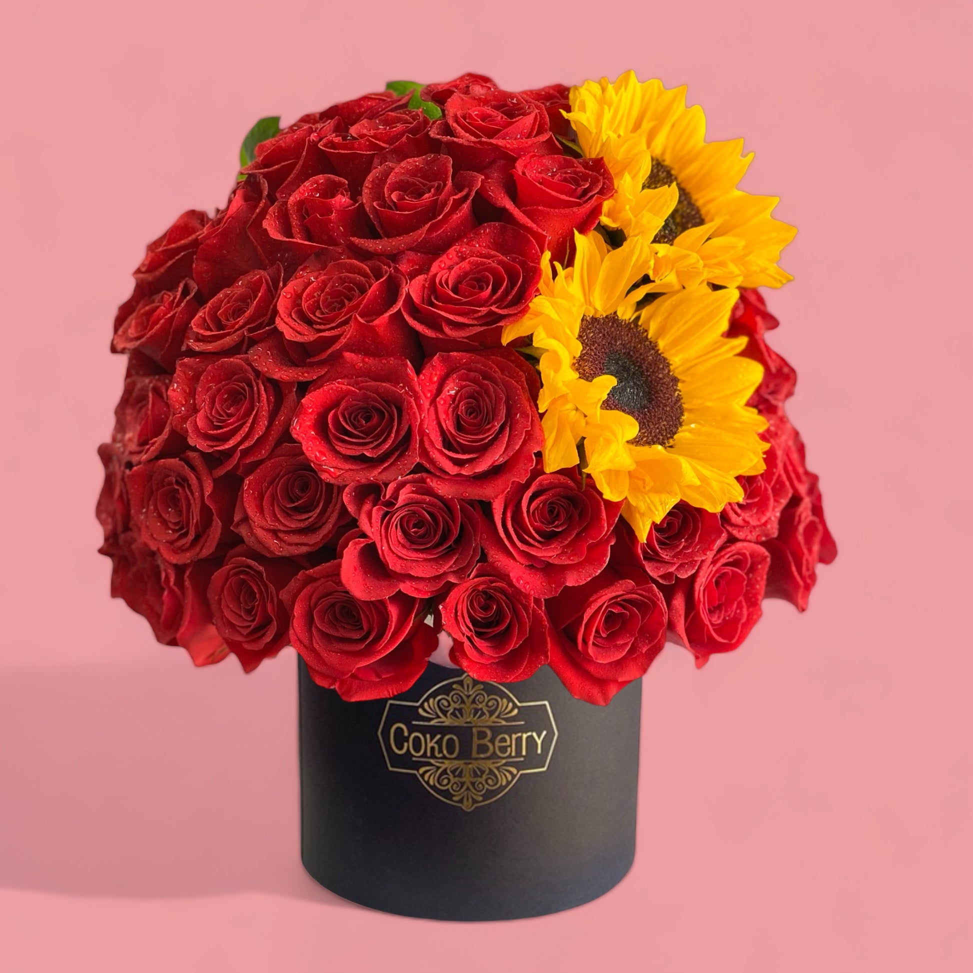 This luxurious 180° arrangement of red roses with stunning sunflowers symbolizes happiness and love. The back features fresh greenery, and the box lid is inserted behind the arrangement for perfect support and presentation.