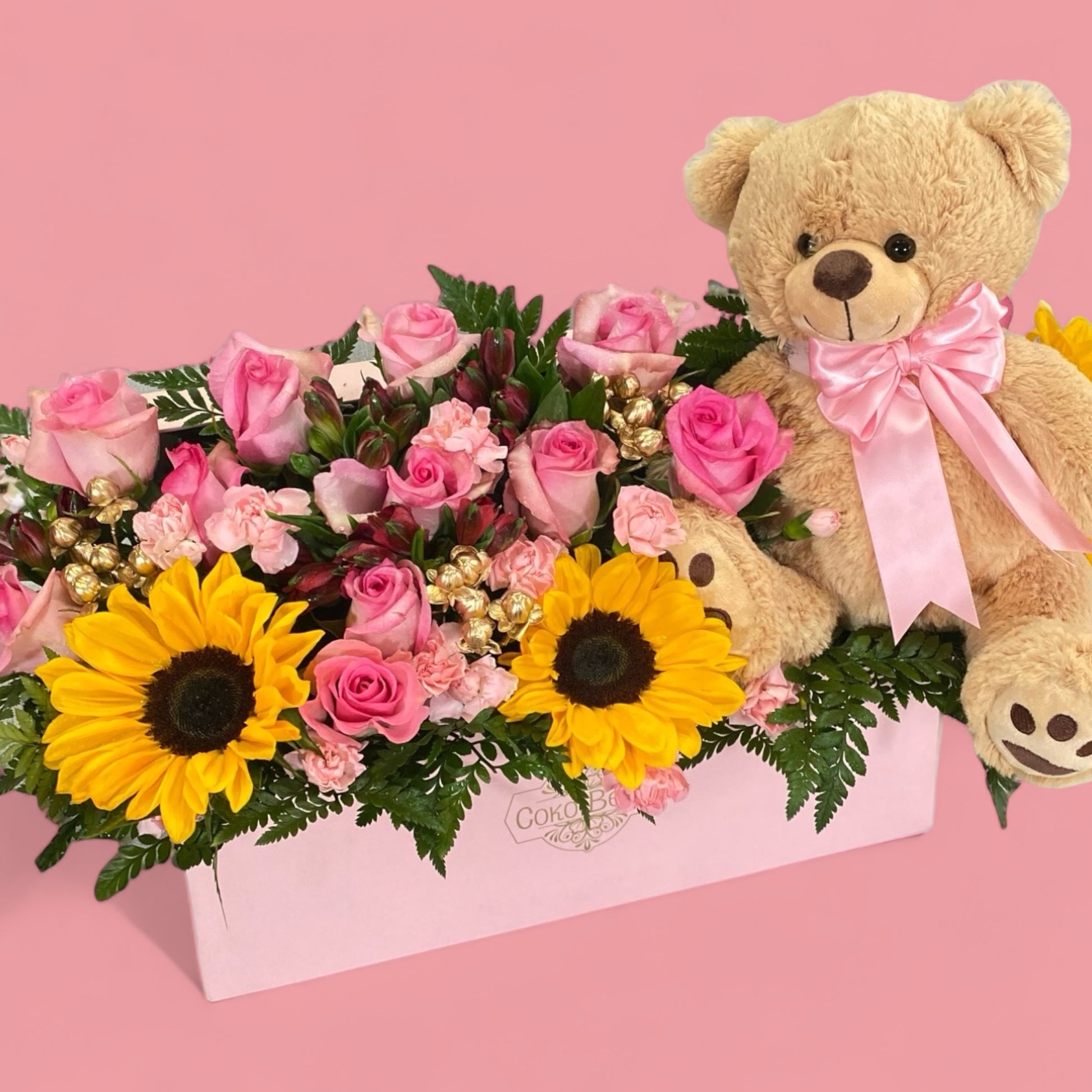 Teddy Bear pink roses and sunflowers