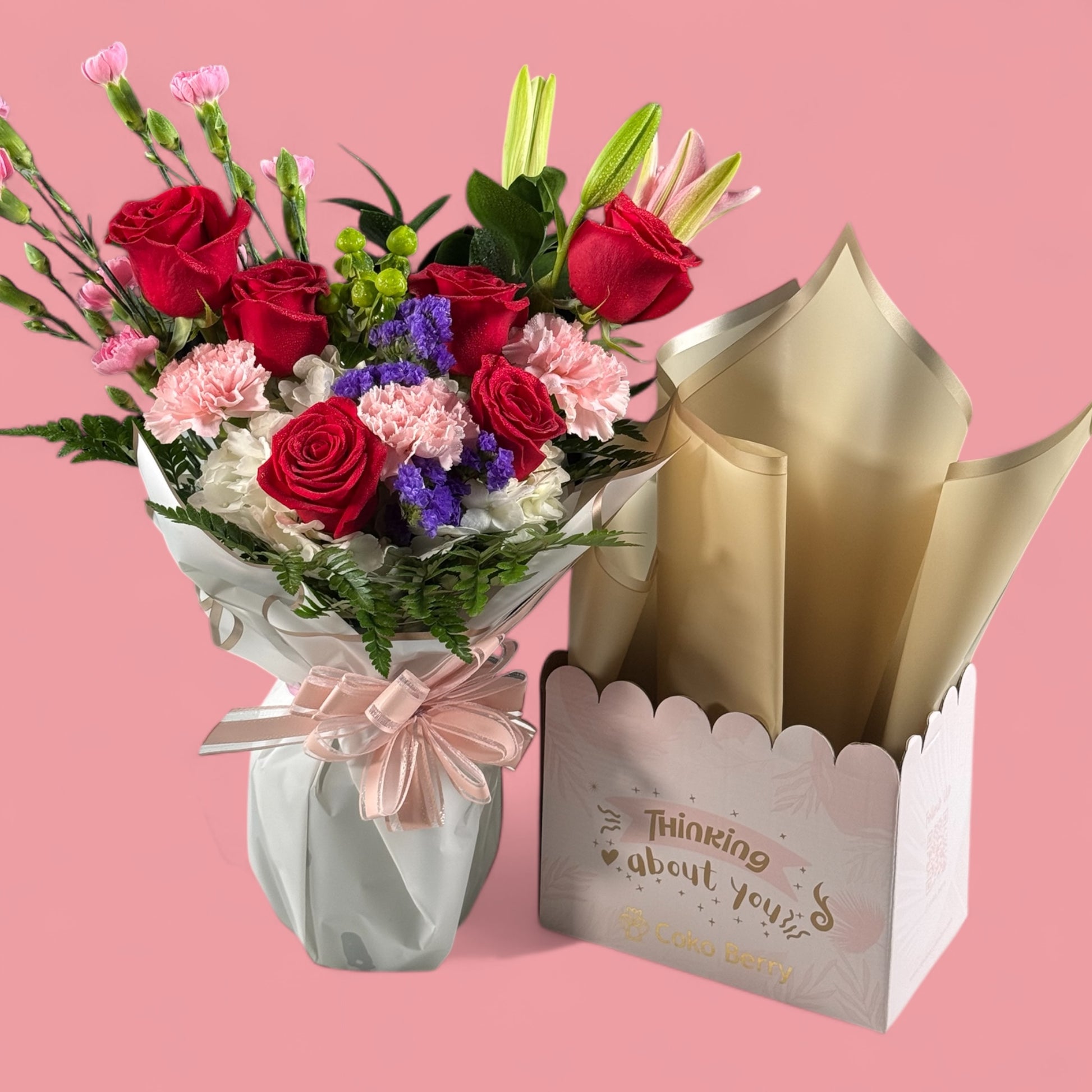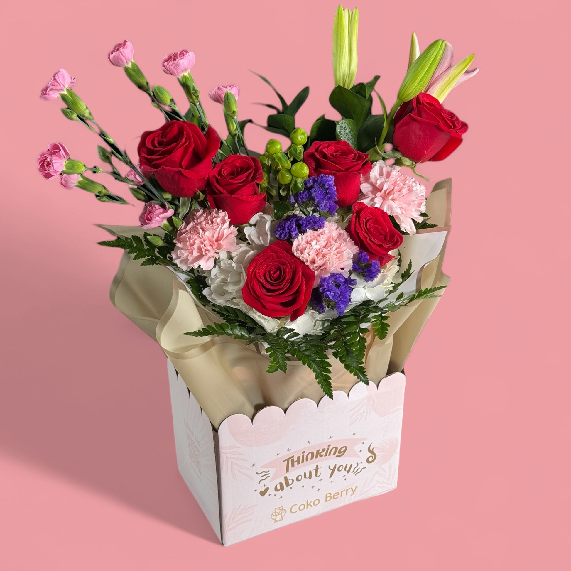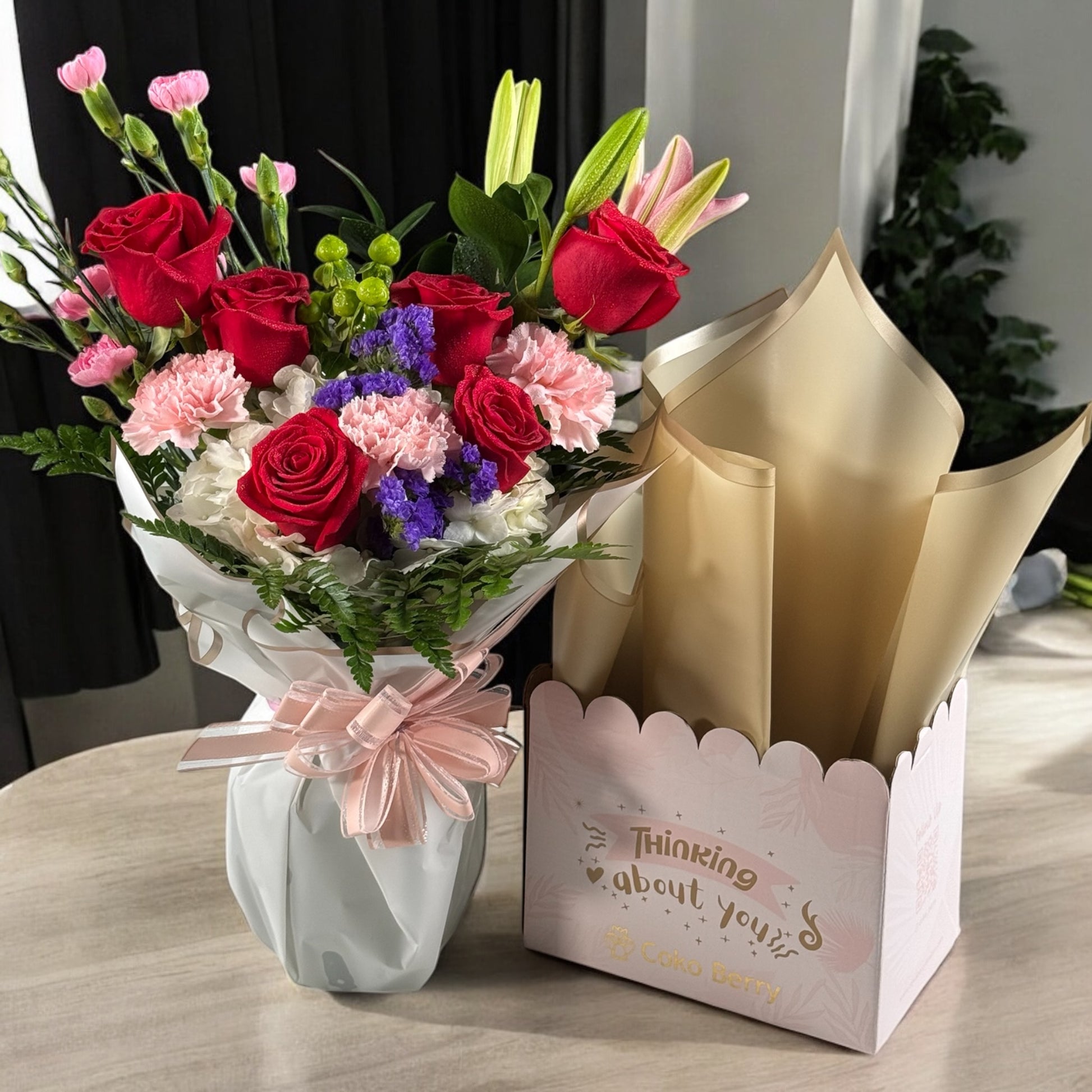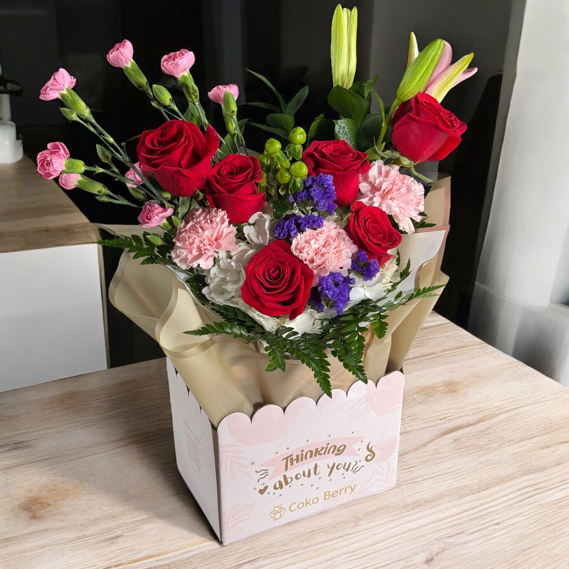 Our flower box are made with our waterproof paper, flowers in a glass vase and it in a box with the message: Thinking about you.